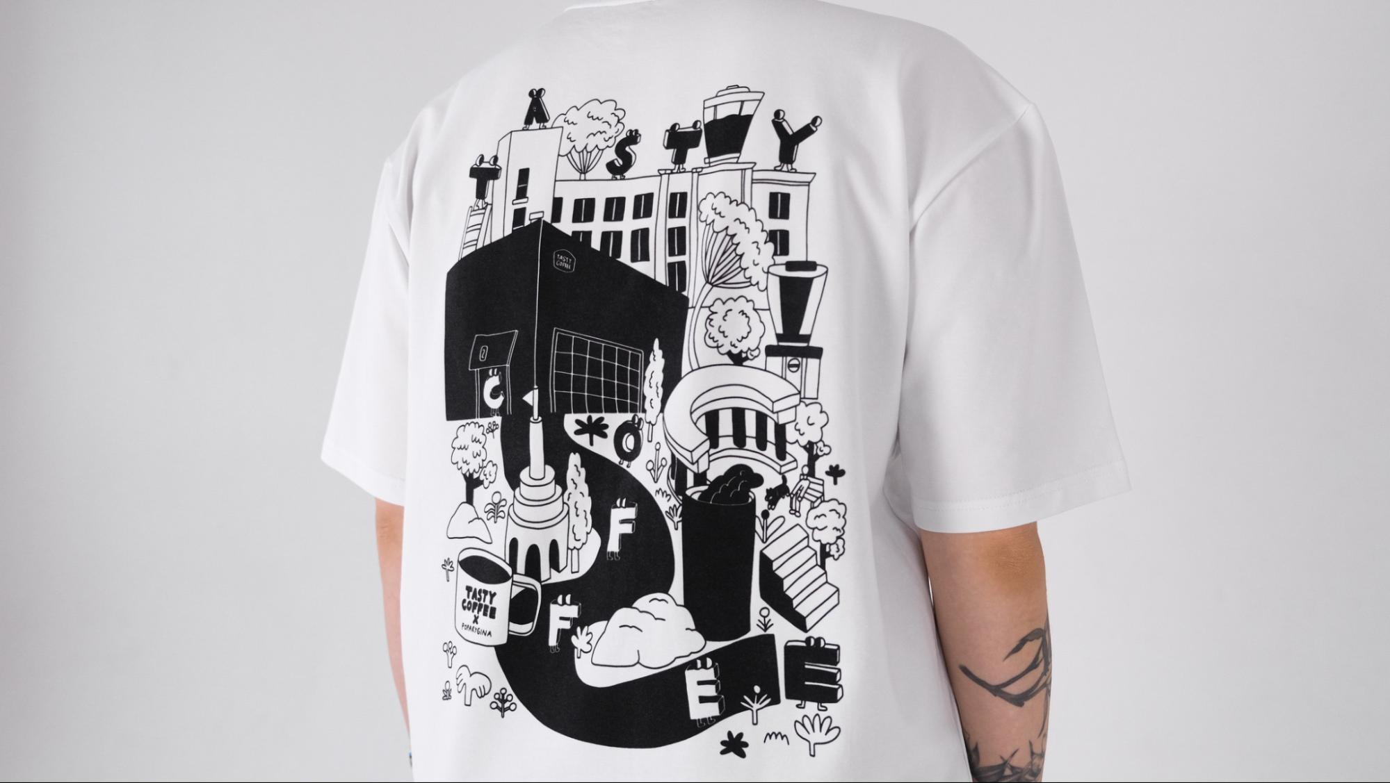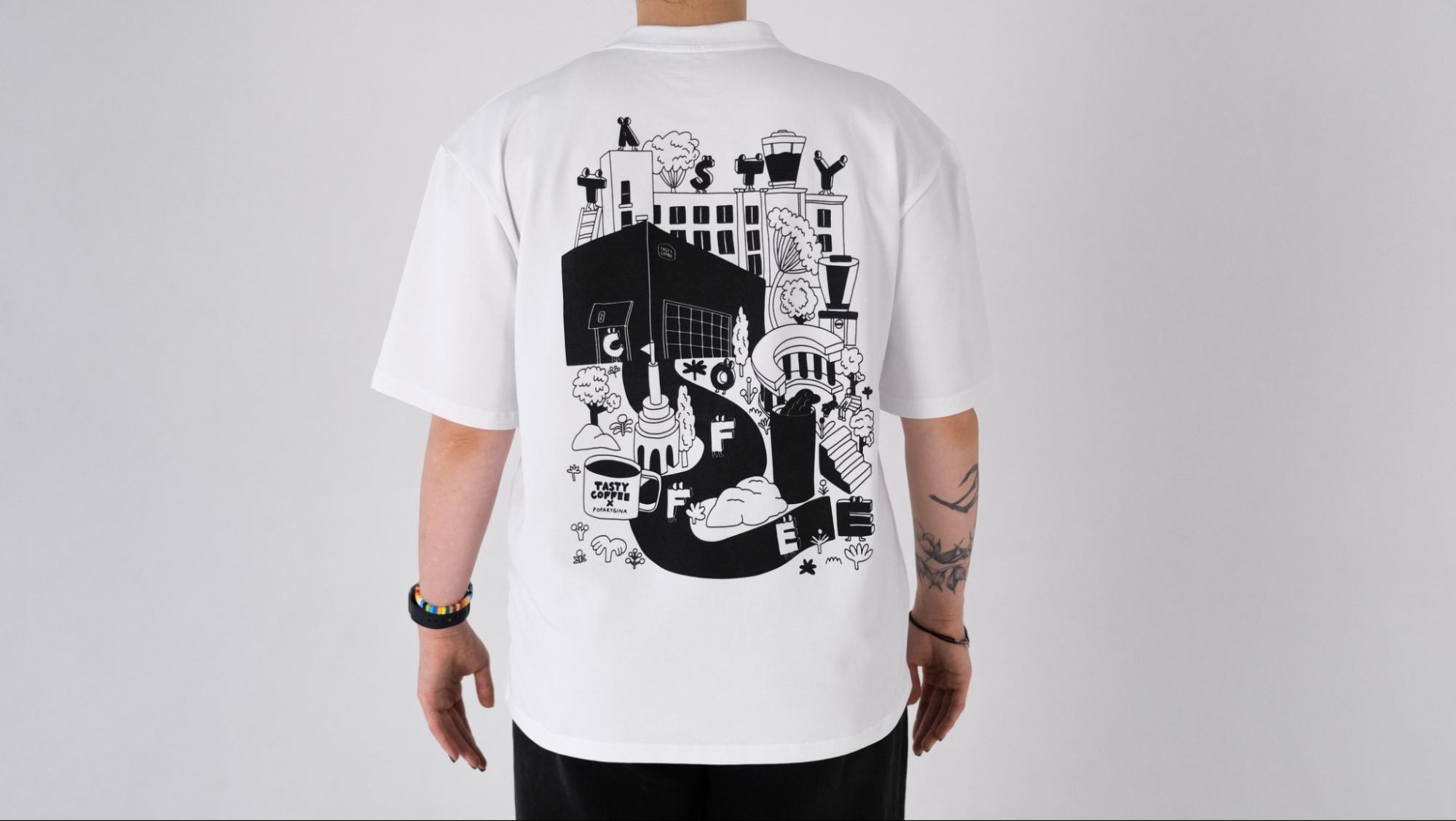 В итоге на принтах получилось изобразить целый мир, который хочется рассматривать и изучать. На футболках мы отразили пространство вокруг нас, а на лонгсливах — пространство внутри нашего производства. Этот мир населяют персонажи — их мы показали через буквы нашего логотипа, которые оживили.
